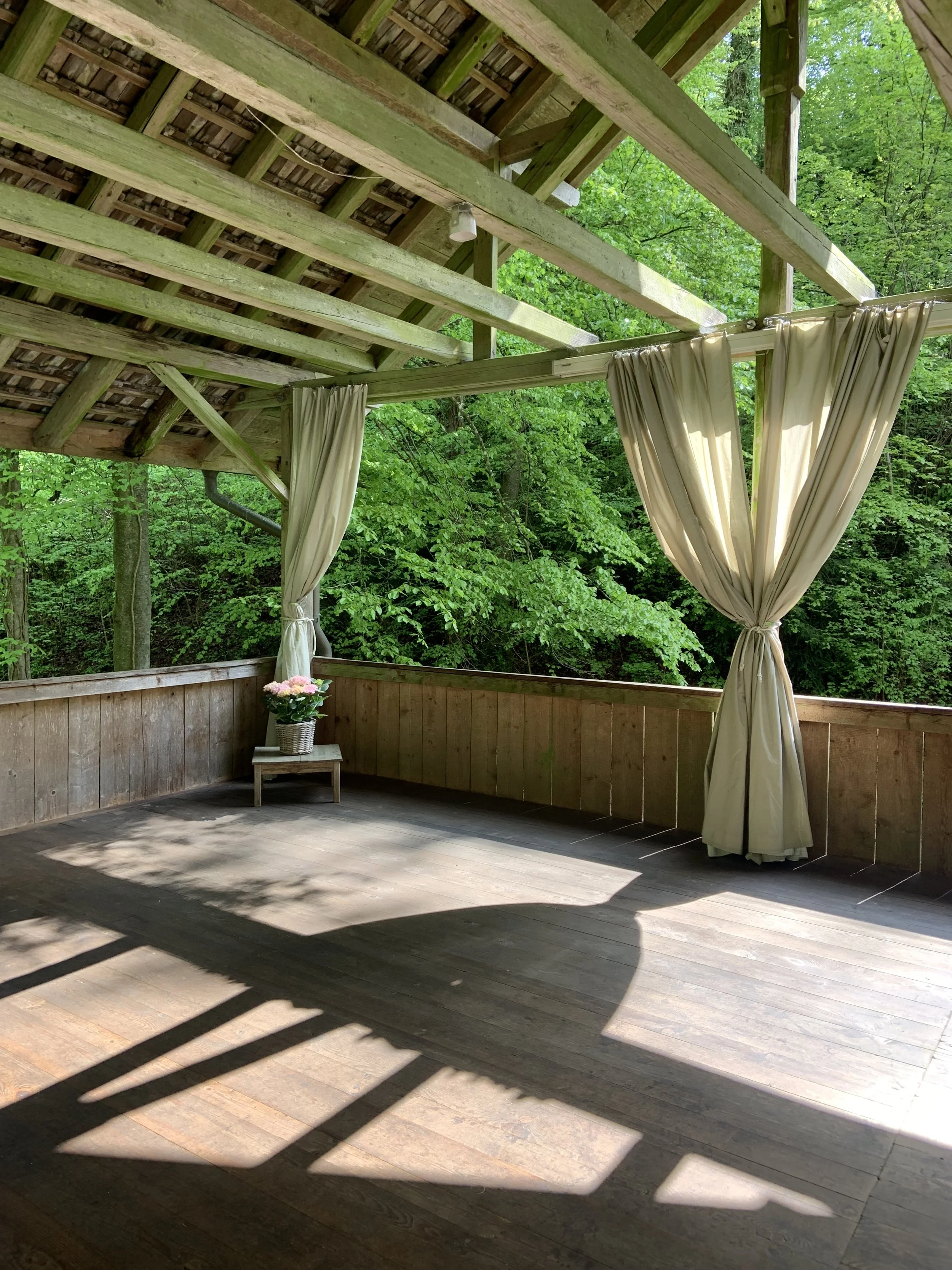 In der wunderschönen Yoga-Scheune im Wald in Meilen. Das Yoga findet im 1. OG statt. Der Raum ist gedeckt und offen mit Blick in den Wald.